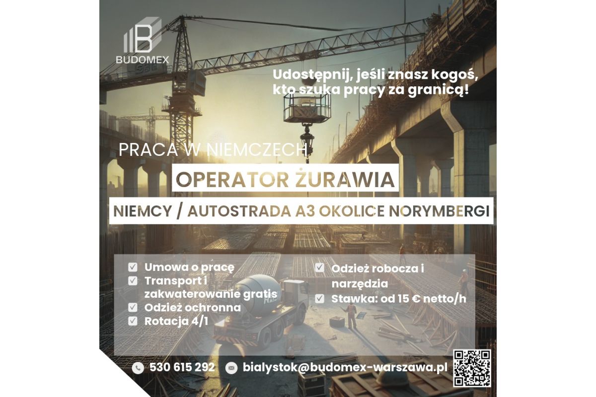 #OperatorŻurawia #PracaNiemcy #BudowaAutostrady #DźwigBezKabiny #SterowanieZDółu #PracaNaBudowie #LegalnaPraca #ZakwaterowanieGratis #TransportGratis #SOKABAU #Zatrudnienie #OperatorDźwigu #PracaZawodowa